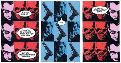 [For those of you not familiar with the story, early on in their master and protégé relationship—at the time when Wilde was just beginning to irritate Whistler by misappropriating many of Whistler’s aphorisms and witty sayings and claiming them as his own—Whistler and Wilde were both at a dinner party and among the guests there was an art critic from one of the London papers. Whistler—with Wilde hanging on his every word—having recently read one of the critic’s reviews, was telling him in no uncertain terms that, because the critic wasn’t, himself, an artist it was inaccurate for him to say in a review that “this picture is good” and “that picture is bad.” As a non-artist, it was only accurate if he was to limit himself to “I like this picture” and “I don’t like that picture.” Whistler then took the critic’s arm and graciously added, “Come now, and have a hock and seltzer. You’re sure to like that.” Dazzled with admiration at Whistler’s deft touch, Oscar said, “I wish I had said that.” To which Whistler replied, “You will, Oscar. You will.”] So that was when I first conceived of the idea of doing a fake Andy Warhol of Neil Gaiman and decided I had better take a look at a collection of actual Andy Warhol pictures to make sure that I got it right. Part II: Neil It’s a very unique experience to go back and look at a book that you’ve used for research purposes as opposed to a book you’ve looked at or read only for your own pleasure. Since there’s more at stake with a research book, it tends to create a more vivid memory by its first impression. I’ve just gone back to the library and checked out Andy Warhol Prints: A Catalogue Raisonné 1962-1987. I remember vividly the first night when I had flipped through it. Oh. Gee. These are really bad. It’s kind of funny now, but at the time it was very disheartening. Page after page, thinking, “I really don’t like any of this stuff. I think Mark Buckingham’s fake Andy Warhol’s in Miracleman put the real Warhol to shame.” Because I wasn’t just flipping through for my own pleasure (I would’ve just put it back), I started asking myself questions. Well, okay, why do I think these are bad? The garish colour was at the top of the list. Not just garish but colours that seemed to me to be intentionally offensive, visually. It reminded me of something. What did it remind me of? Oh, black light posters. Really, really bad black light posters where the colours are climbing all over each other. That seemed to be it. Andy Warhol came from a time period when black light posters and ultraviolet lighting (which had actually been around since the 20s) were considered really startling. The fashion for them, I would assume was, at least partly, attributable to the drug culture: mirroring the intensification of colour perception which LSD engenders. It would certainly be a very painterly reaction to see the profusion of black light posters and ultraviolet light effects in nightclubs and to wonder how you could get that same effect with paint or with silk screens. Purple flesh and green hair. Yeah, that gets pretty close. Oh. Gee. These are really bad. There was also a kind of antagonism to the work—as if its subjects were being purposely made unattractive, their features vandalized. This seemed to reach its apogee where the screens had been slashed and cut haphazardly eyes and mouths missing on the various overlays.