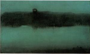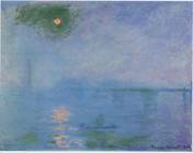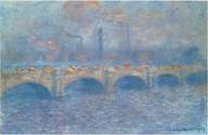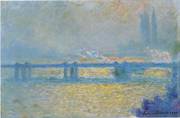 It was interesting coming out of the AGO with Chester Brown after viewing the TurnerWhistlerMonet exhibit because he was the first one to say something and what he said was “I thought the best one was the one that was just a dark strip of green and two light strips of green.” I knew exactly which one he was referring to and had thought the same thing. Later, going through the catalogue I found out that it was called Nocturne in Grey and Silver (Fig.13) and was painted by Whistler c. 1873-75. Whatever qualities it had in person that had so impressed Chet and me it was unable to communicate via photographic reproduction in the catalogue. There it just looked like, well, a dark strip of green with two light strips of green. The only near competitor to it, to my mind, turned out to be called Nocturne: Blue and silver Chelsea (Fig.14) which was painted in 1871. It seems to me that the former, painted at a later date, was a more perfect execution of the idea first developed in the latter, which is why the latter reproduced better. Whistler had, I suspect, come nearer to his intention—having had a couple of years to think about it—and had created a picture that was “all picture” and no discernable technique, whereas the technique is more visible in the earlier version. What was interesting to me was that they both seemed like hard intellectual exercises originating from Whistler’s desire to depict, accurately, fog on the Thames River. (One of the points made in the catalogue is that the London smog—the combination of industrial smoke and fog—through the last few decades of the nineteenth century was, by many accounts, absolutely extraordinary, accounting for the obsessive interest of so many artists in trying to capture the colours and effects it created, colour and effects which had inexplicably vanished by the time the twentieth century was a couple of decades old. By way of example, some years after Whistler, Monet had himself taken rooms on the sixth floor of the Savoy and painted numerous canvases of the Thames, Waterloo Bridge ((Figs. 15, 16, 17) and the Hungerford Bridge. At one point his room was filled with half-finished canvases and he would feverishly change one for another on his easel as the light and colour changed through the day.)