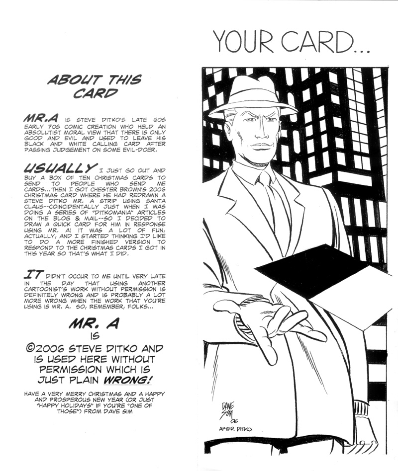 Dave Sim's 2006 Christmas card featuring his version of Steve Ditko's classic Objectivist crime fighter -- Mr. A!