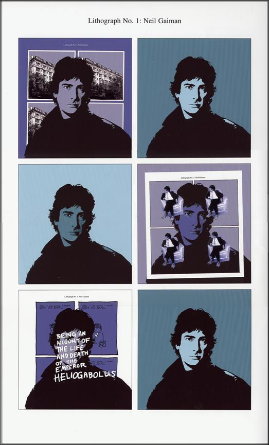 That was good. I liked that. So, I set about the process of photocopying the necessary photographs of the Savoy and Neil the starving journalist and retouching them with the white paint and the black ink, drawing them up as separate compositions in the illustrative fashion that I prefer. Clean lines and tight corners, not messy. Illustrative. So I put together the four images of Neil the starving journalist, did a “rough cut” incorporating the large picture of Neil and I thought, It looks like an album cover. An album cover needs a title at the top. So, I thought I’ll put the Lithograph No.1: Neil Gaiman line in, but just as a placeholder until I figure out what I want to put there. Again, it looked as if it belonged there. So despite the temptation to change it to Second Quarto: The Interview, I left it as it was. That was when I noticed that the background composition was “off”. The four images weren’t “squared up” because I had put the borders on by hand—fast and fun—and hadn’t measured them carefully enough. That was when I decided that I would treat Preney Print & Litho as my Factory. I’m the artist, let them do the hard work of making sure all the lines are the same size and at a ninety-degree angle to each other. I just want to do the fun parts. So I did a mock-up of the Savoy backdrop and then just retouched the photograph with instructions on how it was supposed to look and where it was supposed to go, how wide the inset gutter was supposed to be and left them to it. But I decided to leave the background of Quarto Two cockeyed, by way of emphasizing the extent to which The Interview will always give me a distorted and imperfect mental image of Neil. No matter how close I can get it to realism, it will always be a little lopsided. And I left the “When I was young I loved Gilbert and Sullivan” completely alone. And I even left the caption out of the fragmentary bottom left frame, in case Neil wants to drawn anything in there with his gold signing pen. And I left the other three images of Neil alone as well—no inset images of my personal memories of Neil and no titles. So the viewer has a choice: to have his or her eye follow a curving trajectory from top left to middle right to bottom left and see the strange “Neil Gaiman of Earth-Dave” or to have his or her eye follow a curving trajectory from top right to middle left to bottom right and see Neil Gaiman. Just as he actually is. So, these three images—alternating a dark teal and a light teal on the background and on Neil’s features—constitute the Fourth Quarto—hence, its name: “Neil, Neil, Neil”. Part IIIb: Neil I was privileged to attend Will Eisner’s 80th birthday reception at the Cartoon Art Museum in Boca Raton, Florida in February of 1997 and to be invited to a brunch the next day at his home. As my then-girlfriend and I knocked at the front door, I could hear a very emphatic discussion taking place inside. Will answered the door himself. “Come on in, come on in, just the man I was looking for,” he said, shaking my hand. And then to my girlfriend, “Forgive me. I have to steal your boyfriend for a moment.” He led me by the arm into the kitchen. “We’re having a very interesting discussion about the difference between the auteur in comic books and the collaboration and which is better.” I agreed that that sounded like an interesting subject and poured myself a coffee from the urn on the counter. When Will and I turned around all of the comic-book people who had been arguing so vociferously had melted into the woodwork. I have that strange effect on people. Neil was one of the comic-book people there and he hadn’t so much melted into the woodwork as he had moved away at an oblique angle in the direction of the living room. “You know, Neil,” I said, “What I’ve always admired about you and Alan Moore is that you’re very careful in your scripts to describe everything as meticulously as you can—down to the last visual detail—as you envision it. And then you always write to whomever the artist is, ‘This is just a suggestion. If you can think of something better, feel free to ignore all of this’.” Neil had made vague head movements in response. In retrospect I suspect that he thought that he had been too slow at evacuating the kitchen and so had been elected fall-guy for the comic-book collaboration side of the argument. And that I was firing a first salvo in the argument and he was, therefore, bracing himself for whatever might come next. But that was all I had to say. On the one hand I was acknowledging that no one there was interested in discussing the subject with me. On the other hand, I wanted to make what I thought was an important point in an end of the comic book medium—and, hence, the industry—in which I have had very little participation. My point was: given the extent to which Alan Moore and Neil Gaiman transformed the level of literacy in mainstream comics with their work, no one could have been too terribly surprised had they chosen to turn into complete dictatorial bastards with their collaborators. And, had they done that, I’d bet you dollars to donuts that you could’ve watched “getting to be a dictatorial bastard with your collaborators” spread like cancer as one of the job perks of being a top-ranked writer. But both Alan and Neil knew, instinctively, that that wasn’t the way to get the best work from people and it certainly isn’t the way you have fun getting your work done. I mention this because Lithograph No.1 Neil Gaiman is a collaboration between Neil and myself in just this way: As I flip through Andy Warhol Prints, I note with interest the number of different techniques he has used in the production of his pictures, the number of his prints which were each individualized by something he chose to do with them. As I said earlier, I like very clean lines and sharp corners, so this is how I picture Lithograph No.1: N