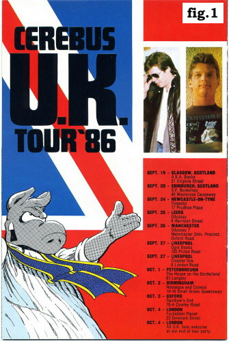 UK Tour poster (Fig.1) As the cliché goes, I was “flush with my first major success”—the decision to print the entirety of the 500-page High Society (Cerebus 26-50) storyline under one cover and to sell it directly to the Cerebus readers (the distributor orders had been woefully small and insufficient to pay the whopping printing bill)—and had determined to try some more ambitious promotions with my brand-spanking-new six-figure bank account. One of the hidden motives, of course, was that I wanted to experience “High Society living” analogous to that experienced by Cerebus in the titular graphic novel: I had developed a weakness for world-class hotels, an appetite which had only been whetted by stays at Ottawa’s Chateau Laurier, Toronto’s Royal York and Hilton Harbour Castle Hotels, New York’s Waldorf-Astoria and The Plaza. The Savoy was definitely on my list. So it was partly an indulgence of my taste for the high life and partly a sincere effort at promotion that led me to contact the Publicist at Forbidden Planet and to see if he would be able to drum up some journalistic interest in the world’s only 300-issue graphic novel and its two would-be perpetrators by inviting all interested journalists to a Press Reception in our suite at the Savoy. I forwarded the usual pile of promotional items that are of use in such instances and attempted to do the same through the various stores along the way. That was when I learned a first, hard media lesson about England. It is, indeed, a dinky little island but dinky little islands (with no domestic newsprint sources) also produce dinky little newspapers; dinky little newspapers which need every available square inch of newsprint to shrill and shriek about this, that and the other tempest-in-a-teapot du jour and are, therefore, not overly amenable to finding merit in colonials who are attempting to draw and write a 6,000 page graphic novel, who are only a quarter of the way through same and whose graphic novel has not been optioned for the cinema or a television program and which has nothing to do with bloodshed, perversion, the Royal Family or admixtures of the three subjects about which the newspaper might shrill and shriek in a few self-aggrandizing paragraphs. I’m not sure what English television and radio news is like now, but then it was very much like Canada’s (which was modeled upon it): the BBC and CBC being Pravda writ small, government mouthpieces and, besides that, a couple of freelance corporations at the periphery (the news, if it could be called that, so much resembled a Monty Python skit that I kept waiting for the punch-line at the end of every item). And, of course, we had the colossal misfortune to be over there at the same time as Frank Miller, who was there on DC’s nickel as they tried, as well, to beat the bushes for media coverage with Time-Warner money behind them in an effort to capitalize on (what I believe was) the release of the final issue of The Dark Knight Returns in that Year Before what would prove to be the most lucrative and influential year in the company’s history (thanks largely to Alan Moore and the same Frank Miller). As the resulting Dark Knight coverage was less of the Rolling Stone feature profile variety Frank was then getting used to and was, instead, mostly of the “Holy Splat! Bam! Pow! Cartoonist wows UK Bat-fans” variety I counted myself rather luckier than not, in the long run, that it was Frank and not me who was the object of (second hard media lesson) the universally patronizing London media. Of course that still left us with our Press Reception and on the afternoon in question, having thrown open the mini-bar and ordered hors d’oeuvres and bowls of caviar from room service, I prepared to seduce the three members of the fourth estate who had turned up at the behest of the Forbidden Planet publicist and (thereby) to make them do my journalistic bidding: Roz Kaveny, Dave Dickson and Neil Gaiman. Of the three, Dave Dickson (I was informed by the Forbidden Planet publicist) was our big “coup,” since he wrote regularly for the music press in England: the big guns, New Music Express and what-not. He had (reportedly and confirmed by him in our pre-interview chat) been out for a night of drinking on one occasion with Keith Richards. He was a Cerebus enthusiast and it was, as I recall, the appearance of Mick and Keef in the book a few months before which had won him over to the idea of doing a piece on the Tour. He was an elfin fellow who looked for all the world like a small replica of David Bowie and who wore his rock ‘n’ roll credentials with distinction. I remember he took over Neil’s flat when Neil came to America the first time, so it was interesting to me that—since Neil had given me the number of his London flat—I could get a hold of Dave Dickson anytime I chose to fly across the pond and join in whatever rock ‘n’ roll festivities might be going on that weekend. I never did, but at the time, divorced and single, that was always nice to have in the back of my mind as an option. I remember that Mr. Dickson came up to say hello at one of the stops on the ’93 UK Tour and was more-than-somewhat the worse for wear for his rock ‘n’ roll lifestyle-in-proximity (not unusual among music journalists: word to the wise), but still charming and friendly as ever. Roz Kaveney. Well, let me quote Neil again from “300 Reasons…”: She was, and is several sizes bigger than I am, huge as Thomas Aquinas and just as large as life: all dressed in black leather (Roz, that is, not Thomas Aquinas, who was a Saint), carrying a black leather bag full of manuscripts heavy as bricks, and to top it all she occasionally wears hats…Sometimes Roz would explain stuff, but usually she’d assume I knew what she was talking about. I had a mental map of Roz’s world that was more or less like listening to an ongoing soap opera of truly operatic proportions (with real val