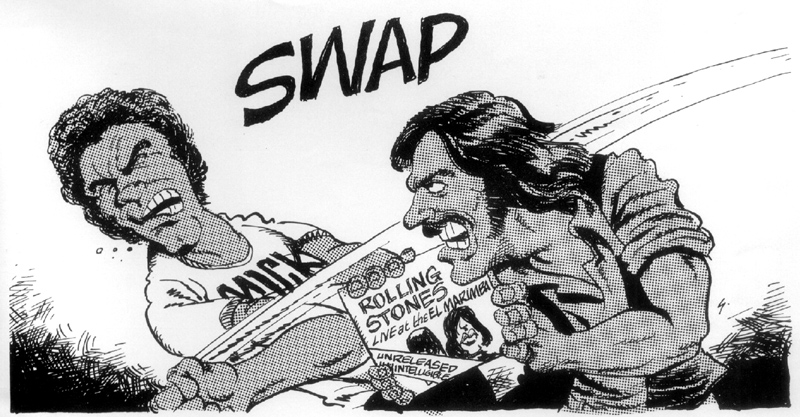 Starting with issue one, we have the logo in classic ComicGraphics era style. Next, we have this great piece, which I'll call "Cocksucker Blues" - as that's the name of the Rolling Stones article that it accompanies. "Proto Mick & Keef."